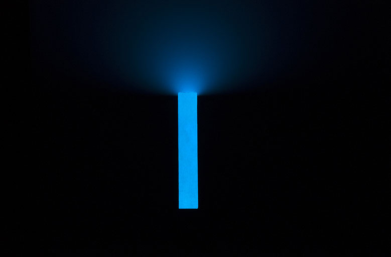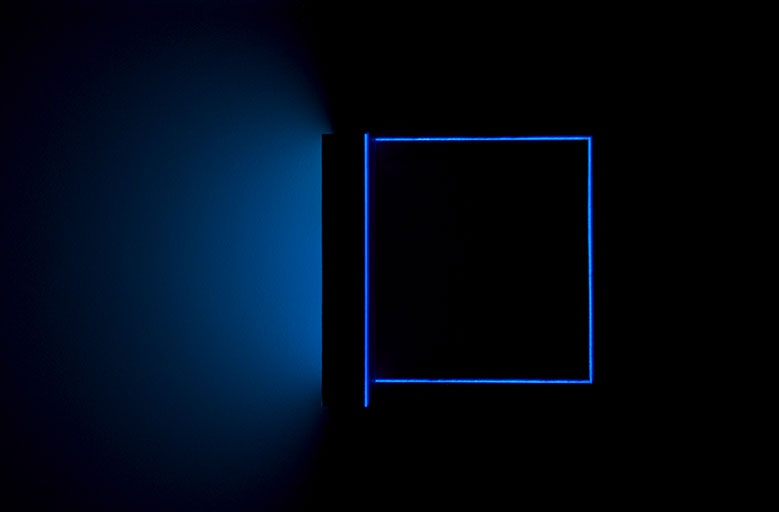 In the darkness, the luminosity of the works is raised to a very high intensity. The painted objects are surrounded by an aura of light and the surrounded space is radiate in colored light.