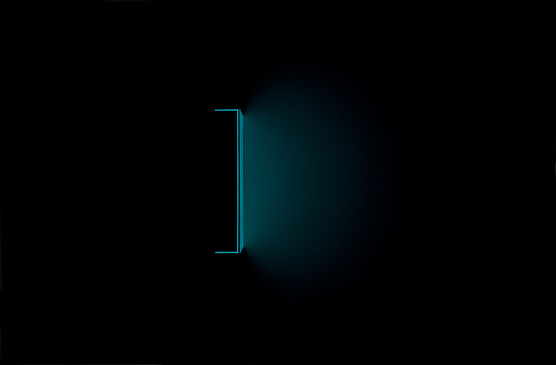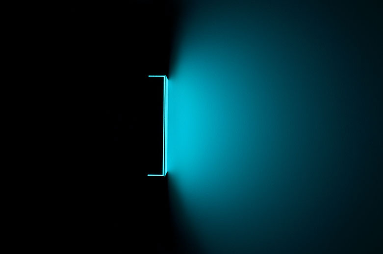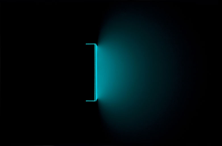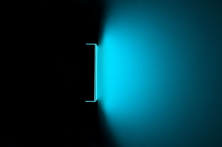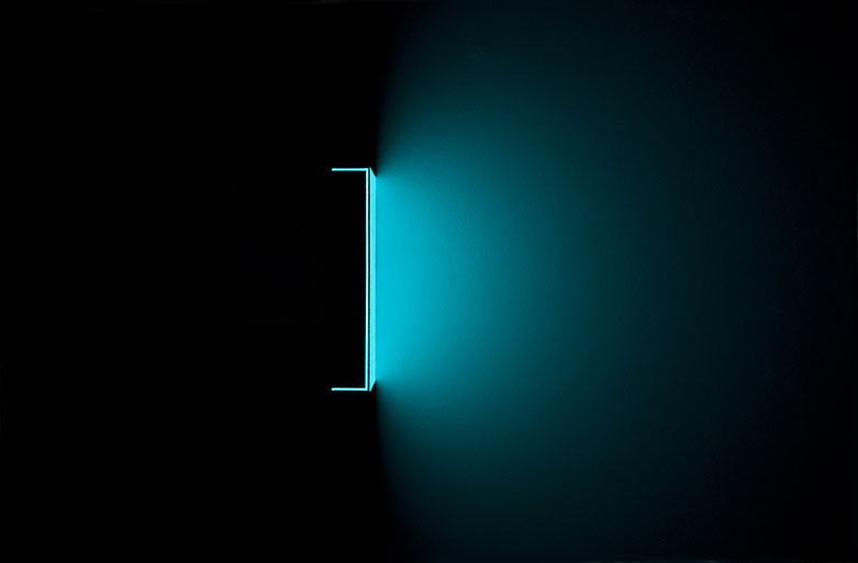 In FR the artwork begins to illuminate blue light and open. I simply examine the invigorating potential in the weight and shape. The installation is enriched by being seen in sequences in which the viewer is led through the exploration of light range.